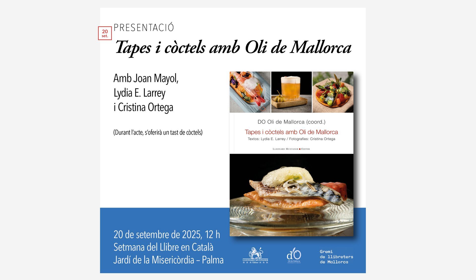 La presentació del llibre va tenir lloc en el marc de la Setmana del Llibre en Català que es va instal·lar als jardins del Centre Cultural de la Misericòrdia, dies enrere. El president del consell regulador, Joan Mayol, va ser l’encarregat de presentar junt amb Lydia E. Larrey i la fotògrafa Cristina Ortega el receptari que recopila les tapes amb Oli de Mallorca dels guanyadors del concurs Oleotapa, propostes de cocteleria amb Oli d’Oliva Verge Extra, a més d’aportacions dels xefs que en algun moment han rebut les distincions de Tafoner Major o Ambaixador que lliura el distintiu.